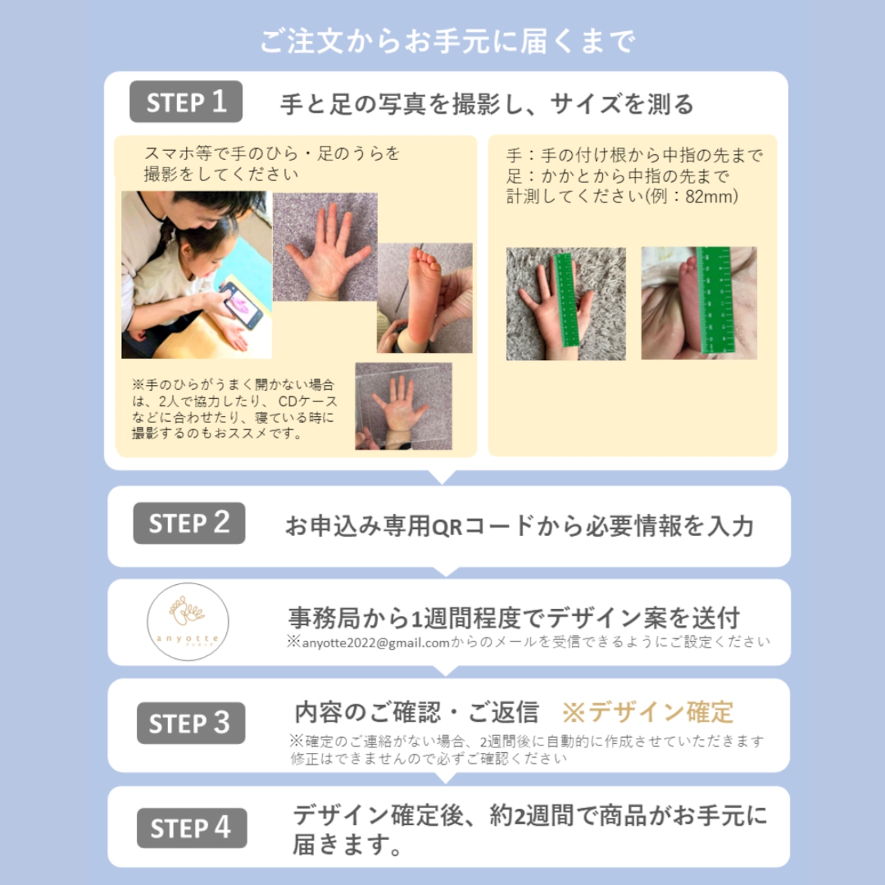 注文確認後、anyotte事務局より専用フォームを[email protected]からお送りしますので、手足の画像・印字する文字など必要事項をご入力いただきます。
