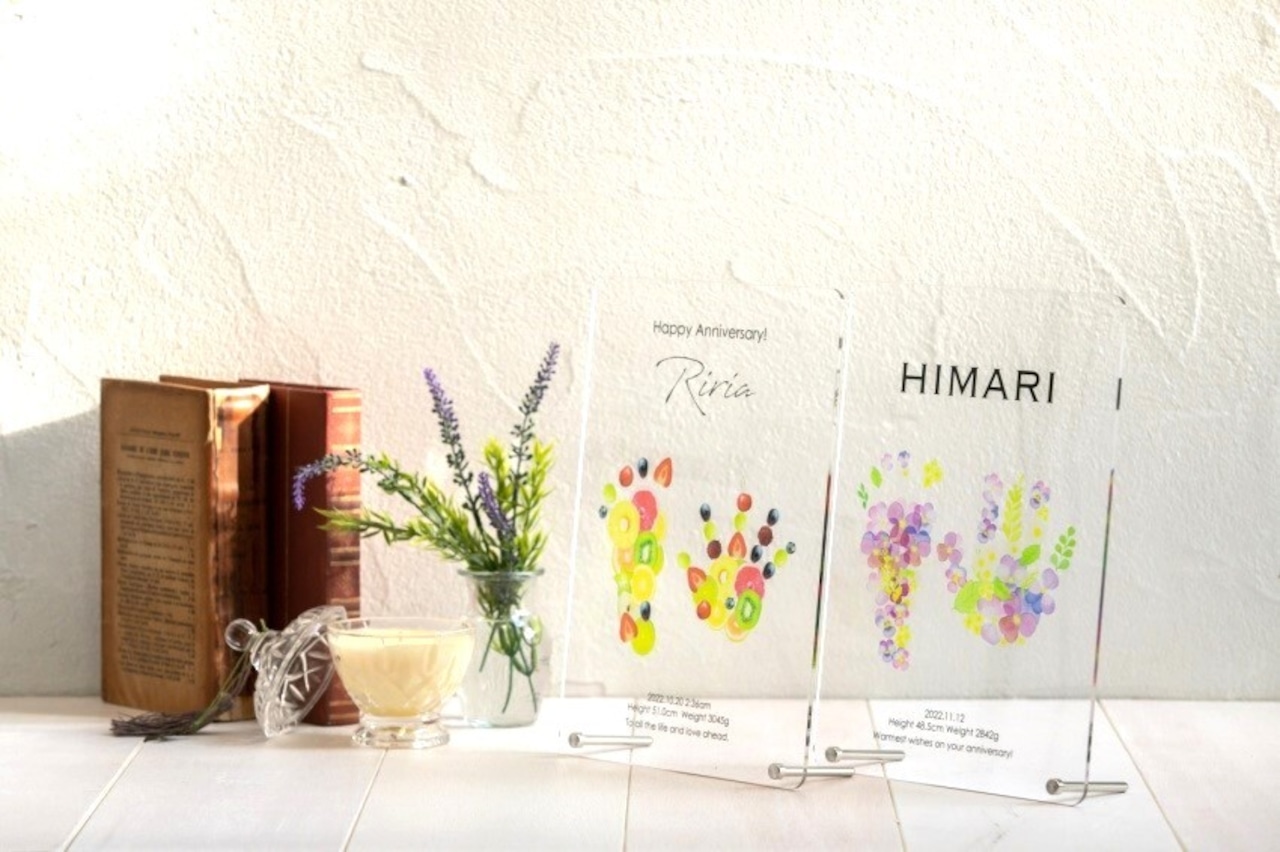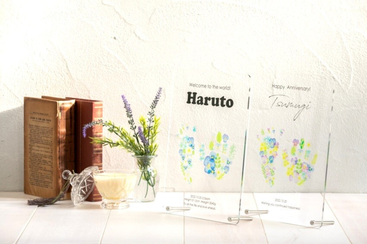 子どもの手のひらや足の裏を撮影した写真を送ると、原寸大のイラストにして職人が一つひとつ手作りでアクリルボードに印刷。