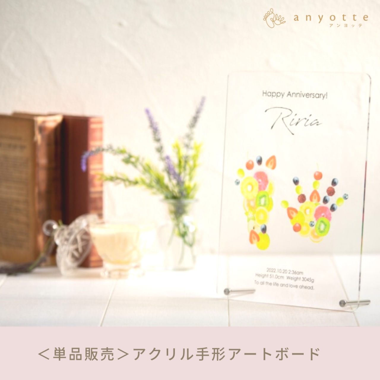 セミオーダーのアクリルボードをお作りいたします。子ども1人の手形と足形を1つずつ入れられます。